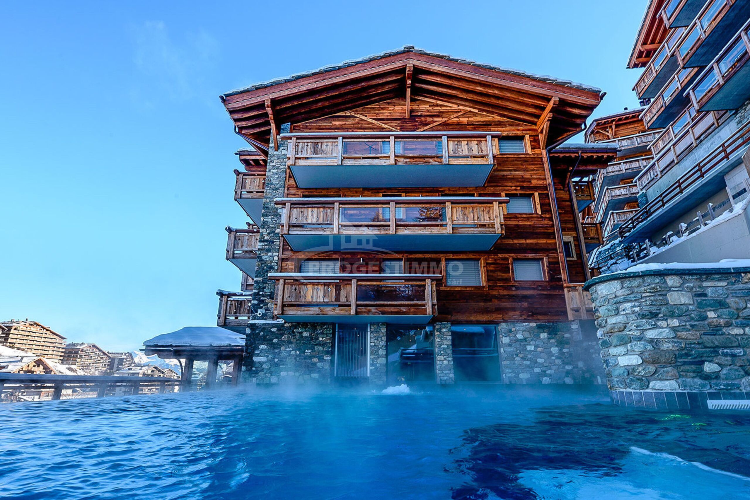 L’architecture du complexe reflète tout le charme des Alpes valaisannes, avec ses façades en vieux bois et sa toiture en pierre, symbole d’un standing intemporel.