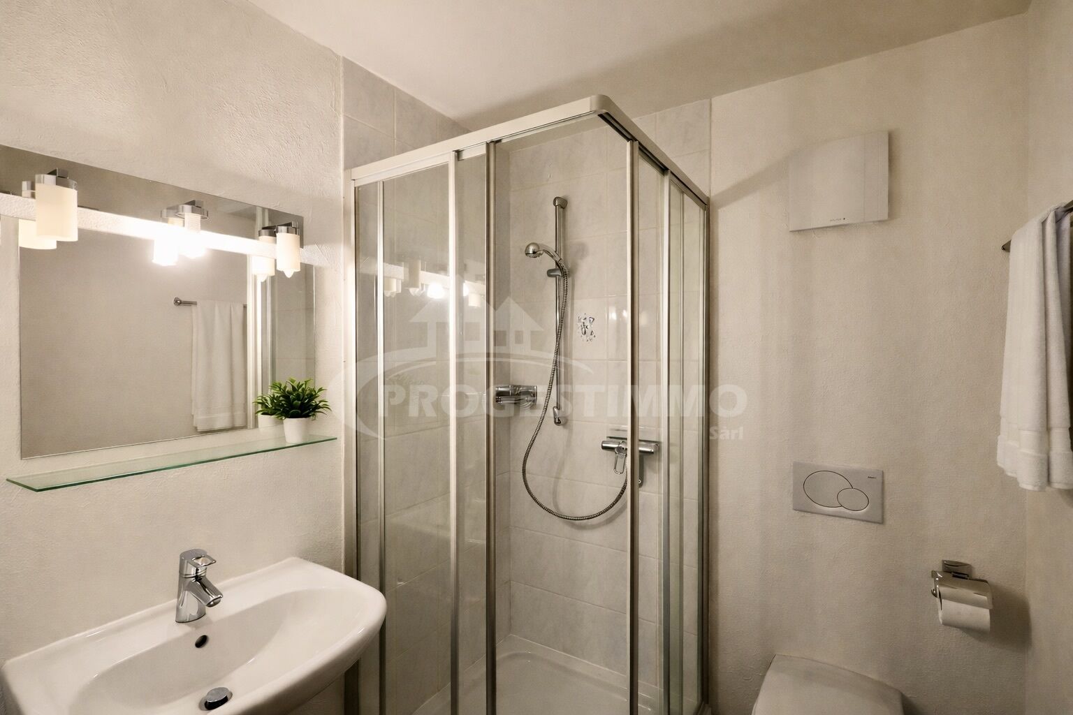 - Une salle d'eau équipée de douche, WC et lavabo