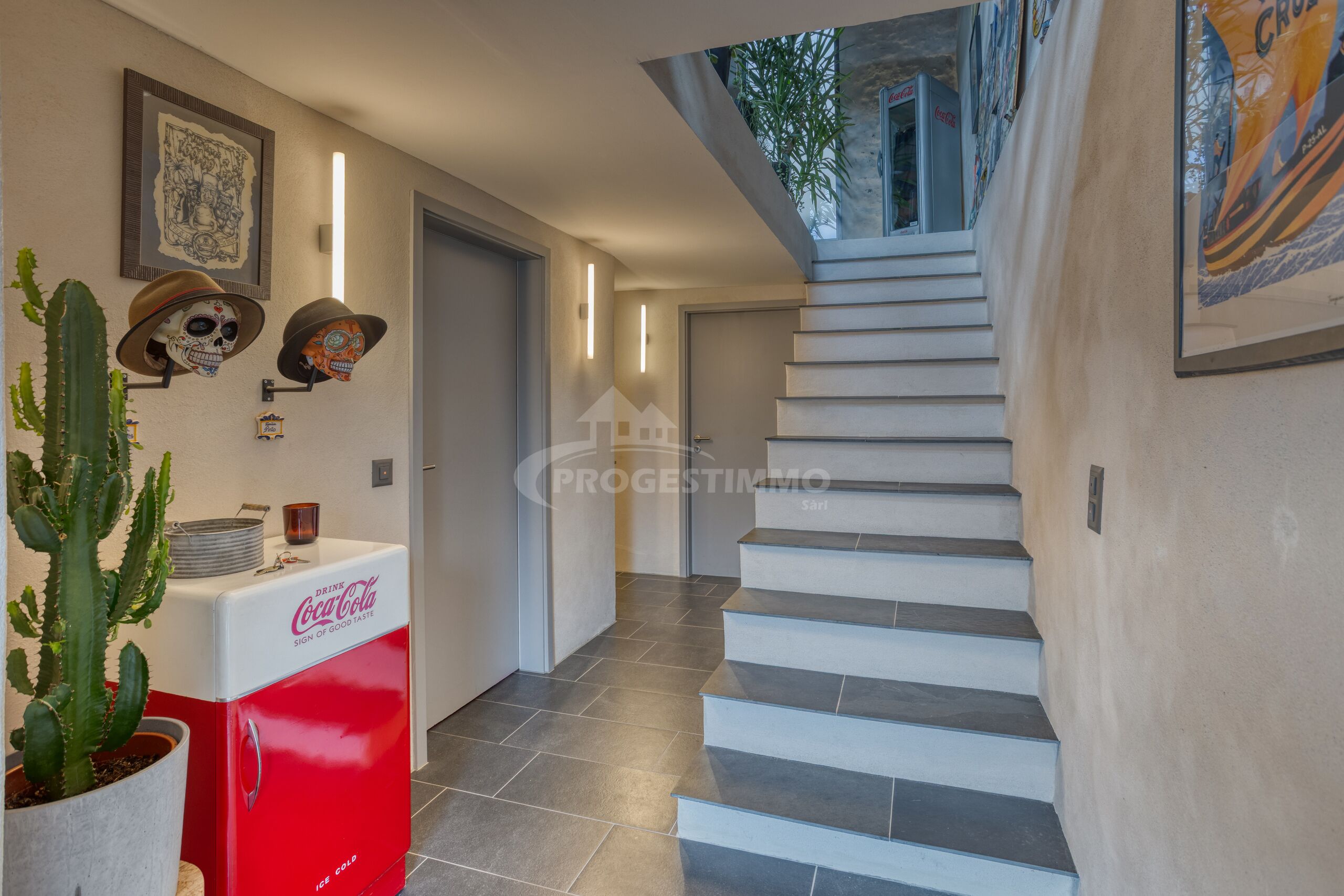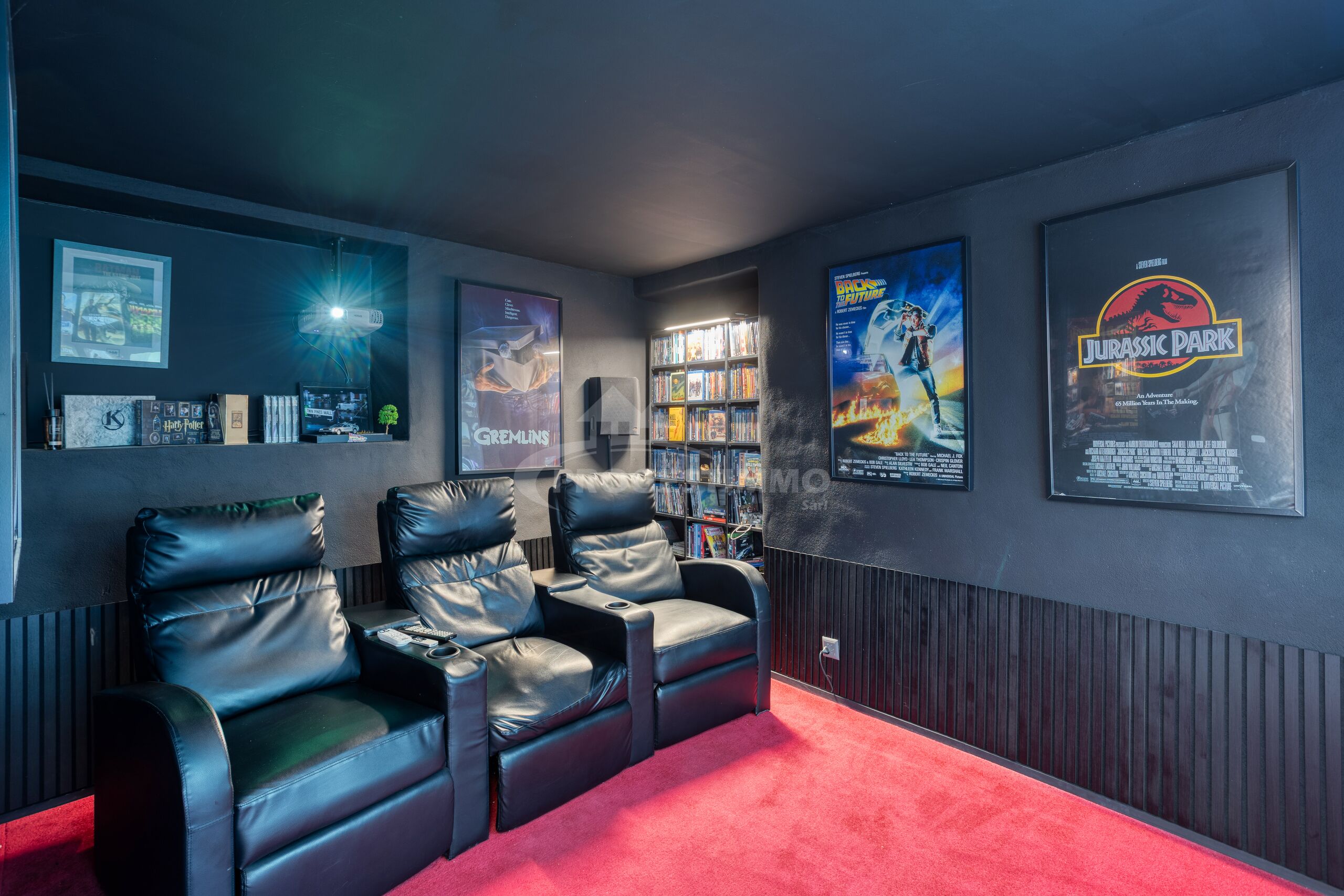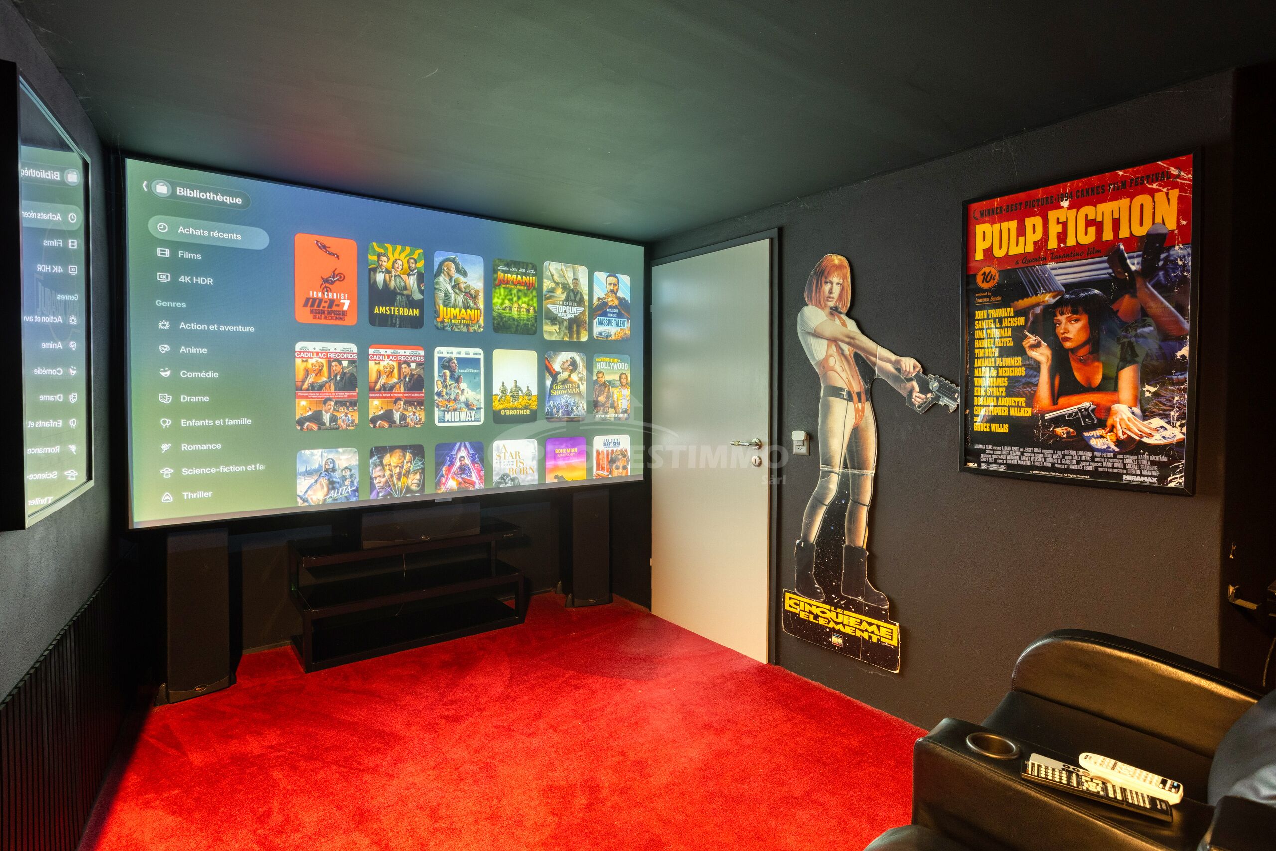 Une chambre, aujourd’hui aménagée en salle de cinéma, une salle de bain avec douche et WC, une pièce avec buanderie et pompe à chaleur air-eau, ainsi qu’un grand garage avec cave attenante. - Étage principal