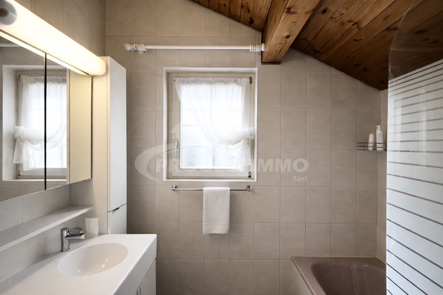 - Une salle d'eau équipée de baignoire, double vasque et fenêtre